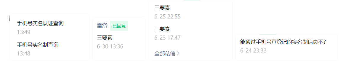 下面是我們近期用戶在后臺留言:全部咨詢手機號實名制查詢(三要素)、手機號實名認證查詢(二要素)。