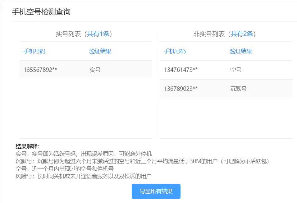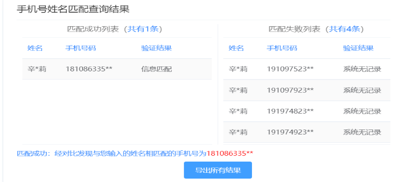 驗證結果顯示:匹配成功與匹配失敗,如果成功表示您精準的驗證到此人手機號碼了。驗證失敗,系統無法匹配結果了。