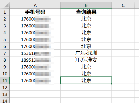 結(jié)果顯示,手機(jī)號(hào)歸屬地、運(yùn)營(yíng)商、區(qū)號(hào)、行政區(qū)劃以及郵編等信息。