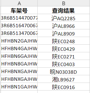 2、上傳文件支持:xlsx,xls格式, 文件內(nèi)容A列為車架號(hào),數(shù)據(jù)必須放在第一個(gè)工作表,首行為表頭字段。請(qǐng)按要求放置參數(shù),避免因放置位置不對(duì)造成查詢不成功。
