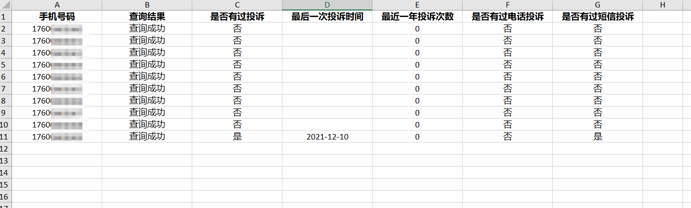 2、上傳文件支持:xlsx,xls格式, 文件內容A列為手機號碼,數據必須放在第一個工作表,首行為表頭字段。請按要求放置參數,避免因放置位置不對造成查詢不成功。