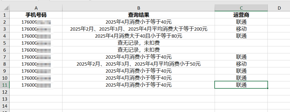 結果顯示,手機號所屬的運營商和近三個月的消費金額均值區間,包含以下幾個區間:小于50元、50元至100元、100元至150元、150元至200元、大于200元。