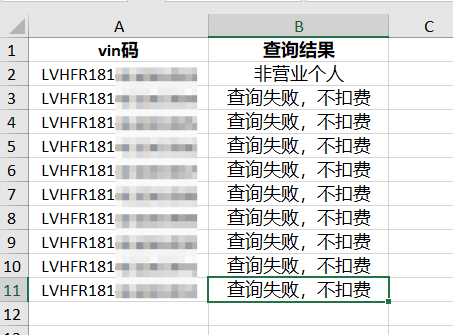 2、上傳文件支持:xlsx,xls格式, 文件內容A列為車架號,數據必須放在第一個工作表,首行為表頭字段。請按要求放置參數,避免因放置位置不對造成查詢不成功。
