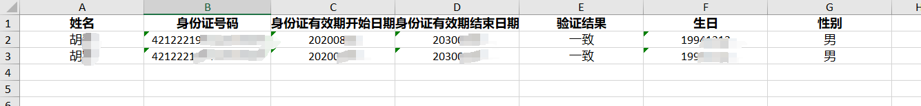 2、上傳文件支持:xlsx,xls格式, 文件內(nèi)容A列為姓名,B列為身份證號(hào),C列為身份證有效期開始日期,D列為身份證有效期結(jié)束日期,數(shù)據(jù)必須放在第一個(gè)工作表,首行為表頭字段。請(qǐng)按要求放置參數(shù),避免因放置位置不對(duì)造成查詢不成功。