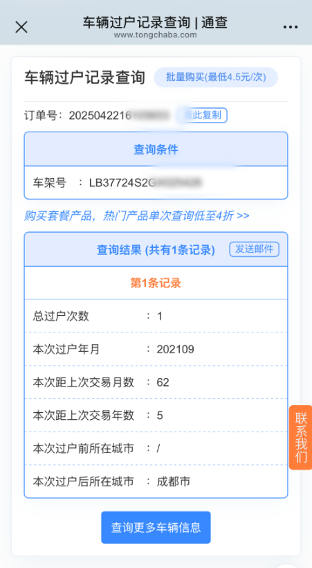 只需輸入車架號,即可獲得車輛過戶的多項記錄,結果清晰明了,能幫助用戶了解車輛的真實交易歷史。