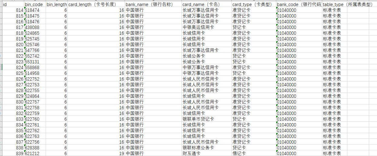 返回結(jié)果:銀行卡BIN碼數(shù)據(jù),包含了:bin碼、bin碼長度、卡號長度、銀行名稱、銀行卡名稱、卡類型、銀行代碼、所屬表類型,數(shù)據(jù)格式為SQL、XLSX、CSV,壓縮文件里包含字段說明文件。